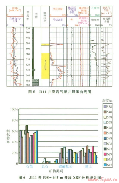 頁巖氣層隨鉆錄井解釋評價參數(shù)確定方法在川東、鄂兩地區(qū)J111、JYHF-1、HY-1、FYHF-1井進行了應用試驗,獲得了比較好的應用效果。這里重點介紹中國石油化工股份有限公司首口頁巖氣勘探試驗井——J111井的應用情況。