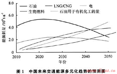 圖1是中國未來交通能源多元化趨勢的預(yù)測圖[1]。