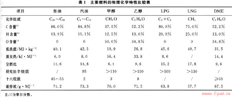 在石油供應(yīng)及其價(jià)格隨世界地緣政治和經(jīng)濟(jì)形勢變化而不斷劇烈波動(dòng)的21世紀(jì),天然氣作為發(fā)動(dòng)機(jī)燃料有很多優(yōu)點(diǎn):單位熱值(比能量)最高,尾氣排放最少,C02排放僅為同熱值汽柴油排放量的3/4,利于改善大氣質(zhì)量,供應(yīng)可靠,價(jià)格低且穩(wěn)定少波動(dòng)。主要燃料的物理化學(xué)特性比較見表1[2]。