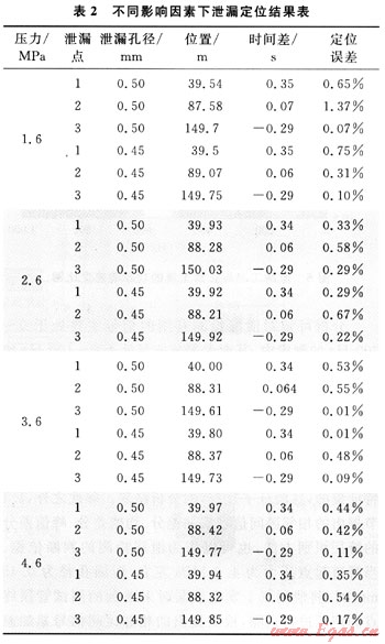 泄漏定位試驗(yàn)是與泄漏檢測(cè)試驗(yàn)一起進(jìn)行的,運(yùn)用泄漏檢測(cè)采集到的數(shù)據(jù),分析在不同泄漏工況下音波法泄漏定位的適用性及定位誤差。不同影響因素下泄漏定位結(jié)果如表2所示。