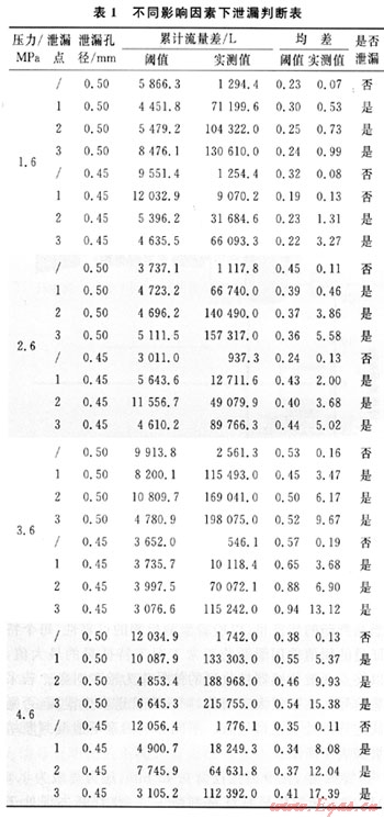 表1中,在泄漏孔徑為0.45mm,壓力等級(jí)為1.6MPa時(shí),泄漏信號(hào)特征量判斷失誤,此判斷失誤處于泄漏孔徑較小,壓力等級(jí)較低的工況,通過調(diào)節(jié)動(dòng)態(tài)閾值及其權(quán)值,可以防止此類事情的發(fā)生。