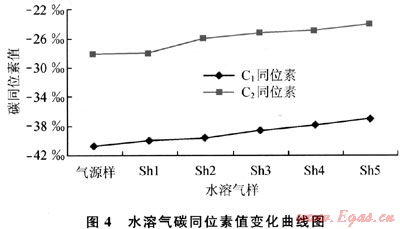 通過(guò)模擬實(shí)驗(yàn),模擬上覆地層壓力和地層溫度條件下,水的溶解作用對(duì)煤層氣中碳同位素分餾的效應(yīng)。煤心樣品選取沁水盆地晉試6井黑色致密煤心,孔隙度為2.3%,滲透率為0.8mD,灰分含量為10.3%,視密度為1.87t/m3,氣樣組分中甲烷為88.29%、乙烷為3.27%、二氧化碳為3.46%、氮?dú)鉃?4.98%,水樣為人工配置濃度為100mg/L的NaCl溶液代替地層水。將煤心放入樣品倉(cāng)中;在5MPa壓力下,充入氣樣使煤心達(dá)到吸附平衡;在一定壓力下,從樣品倉(cāng)左端注入水,每隔2d取一次水溶氣樣。獲得如圖4所示的水溶氣碳同位素值變化曲線。