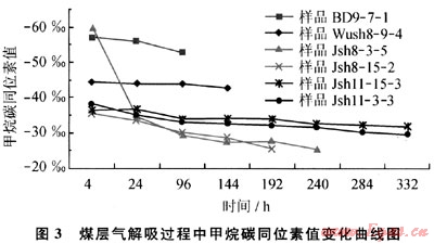 2) 通過(guò)甲烷在解吸吸附過(guò)程中碳同位素的分餾效應(yīng),可以判斷煤層氣成藏過(guò)程。在煤層氣開(kāi)發(fā)過(guò)程中,可以建立某一區(qū)塊煤層氣開(kāi)發(fā)井的甲烷碳同位素值的標(biāo)準(zhǔn)變化曲線,從而根據(jù)開(kāi)發(fā)井甲烷碳同位素的值來(lái)判斷煤層氣井的開(kāi)發(fā)狀態(tài)及采收率。