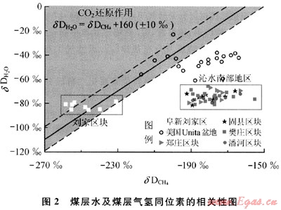 煤層水及煤層氣氫同位素的相關(guān)性表明:阜新劉家地區(qū)煤層生物成因氣偏向C02還原作用,沁水盆地南部煤層生物成因氣偏向發(fā)酵作用(圖2,分析中采用國(guó)際標(biāo)準(zhǔn)物質(zhì)VSMOW):