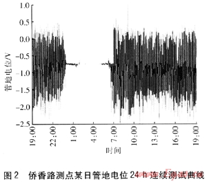 綜合上述調(diào)查內(nèi)容,完成了《僑香路燃?xì)夤艿离s散電流干擾腐蝕控制預(yù)備性測試報(bào)告》。圖2是測試報(bào)告中的某日管地電位24h連續(xù)測試曲線。