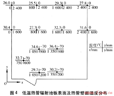 ② 低溫熱管輻射地板表面溫度分布受熱管壁面溫度分布的影響,地板中部溫度高、兩端溫度低的溫度梯度有利于減小地板由邊緣向外部的熱損失。