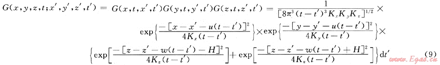 根據(jù)動態(tài)泄漏率不定常的特點,以氣體動力學(xué)理論和湍流擴散微分方程為基礎(chǔ),結(jié)合相應(yīng)的初始條件和邊界條件,利用格林函數(shù)進行推導(dǎo),可得綜合擴散模型格林函數(shù)為:
