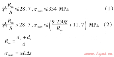 方法2將臨界徑厚比放寬到Rm/δ<40.1,相應壁厚減薄,按方法1核算的極限溫差結果不能滿足最大循環(huán)溫差(120℃)要求,但差值不是很大。