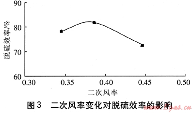 由圖3可知,二次風率為0.344~0.386時,脫硫效率隨二次風率的增大而提高,但是變化很緩慢;當二次風率大于0.386后,脫硫效率隨其增大而快速降低。整條曲線呈現開口向下的拋物線型。由此可以推斷,對于燃燒福建無煙煤CFB鍋爐,當其他運行參數確定時,存在一個最佳二次風率,使爐內脫硫效率最大。