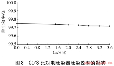 當其他運行參數不變時,Ca/S比變化對電除塵器效率的影響見圖8。