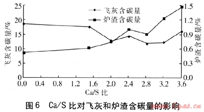 ⑥ 爐內脫硫對飛灰和爐渣含碳量的影響