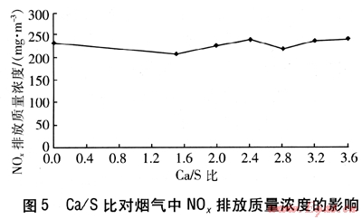 ⑤ 爐內脫硫對N0x排放質量濃度的影響煙氣中N0x排放質量濃度隨Ca/S比的變化情況見圖5。
