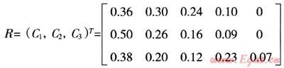 首先對U集中Ui作單因素評判,從因素Ui來確定評語集Vj(j=1,2,3…,m)的隸屬度rij,這樣就得到一個Ui的單因素評判集Ri={ri1,ri2,ri3,…,rim},R就反應了U、V之間存在的某種模糊約束關(guān)系: