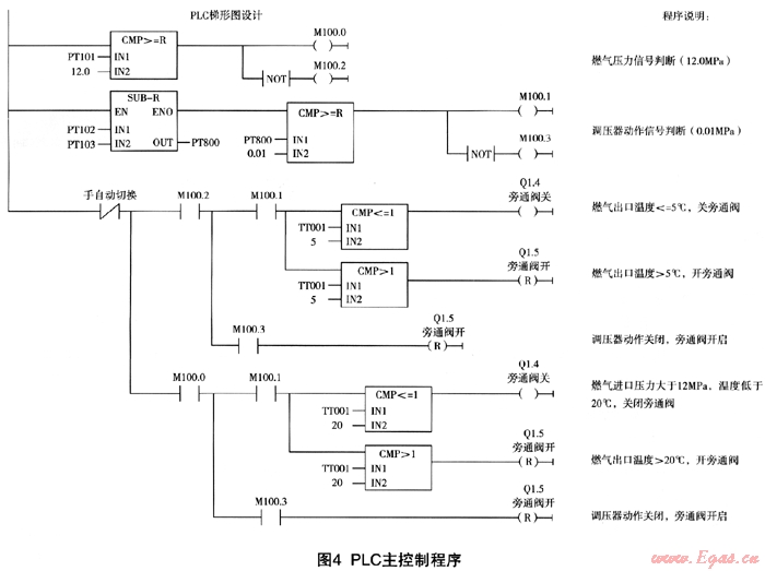 自動(dòng)系統(tǒng)需要4個(gè)開關(guān)量信號(hào):燃?xì)膺M(jìn)口壓力開關(guān)信號(hào)(動(dòng)作值12MPa);二級(jí)調(diào)壓器前后差壓開關(guān)信號(hào)(動(dòng)作值0);燃?xì)獬隹跍囟刃盘?hào)(動(dòng)作值20℃);燃?xì)獬隹跍囟刃盘?hào)(動(dòng)作值5℃)。輸入開關(guān)量信號(hào)采用原系統(tǒng)自有的模擬量輸入信號(hào)(一級(jí)調(diào)壓器前壓力和燃?xì)獬隹跍囟?,通過(guò)PLC控制程序(比較模塊)實(shí)現(xiàn)3個(gè)開關(guān)量信號(hào)。輸出信號(hào)有2個(gè):旁通閥開啟信號(hào),旁通閥關(guān)閉信號(hào)。