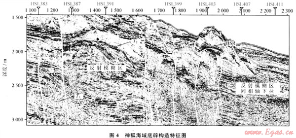 底辟構(gòu)造和天然氣水合物的形成與運(yùn)移聚集也有密切的關(guān)系,底辟構(gòu)造由地球深部物質(zhì)上拱或刺穿到淺部產(chǎn)生,在形成過程中會(huì)引起構(gòu)造側(cè)翼和頂部沉積層的傾斜和破裂,促使流體的排放,因而對(duì)水合物的形成十分有利。大量的調(diào)查資料顯示[14~15]:珠江口盆地白云凹陷中心有大量底辟群的存在,在神狐海域前期調(diào)查中,識(shí)別出了5個(gè)泥底辟異常反射體,其中4個(gè)位于白云凹陷內(nèi)。這些識(shí)別出來的底辟構(gòu)造在高分辨率地震剖面上表現(xiàn)特征主要為地震反射模糊區(qū)(帶),橫向上反射同相軸的連續(xù)性變差或錯(cuò)斷,內(nèi)部反射較雜亂,甚至為空白反射,局部見同相軸下拉現(xiàn)象;其兩側(cè)、頂部常見亮點(diǎn)振幅異常,白云凹陷北坡鉆井已揭示這種亮點(diǎn)與氣層存在良好對(duì)應(yīng)關(guān)系。因此,推斷這種反射模糊區(qū)應(yīng)為流體作用的結(jié)果(圖4)[16]。底辟構(gòu)造的存在說明凹陷中心曾經(jīng)孕育著高壓、超壓系統(tǒng)。由于現(xiàn)今地層具有正常壓力,這說明超壓的累積和釋放與深部烴源巖生烴及排烴有一定的關(guān)系。與底辟構(gòu)造密切伴生的大量亮點(diǎn)指示著沿底辟構(gòu)造的天然氣垂向輸導(dǎo),構(gòu)成了古近系油氣運(yùn)移到新近系 第四紀(jì)的成藏動(dòng)力系統(tǒng)。底辟構(gòu)造的發(fā)育在不同深度形成了上覆拱張,上覆地層產(chǎn)生了高角度的斷裂和垂向裂隙系統(tǒng),構(gòu)成流體運(yùn)移的另一個(gè)通道。