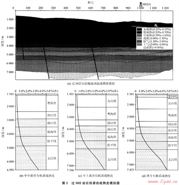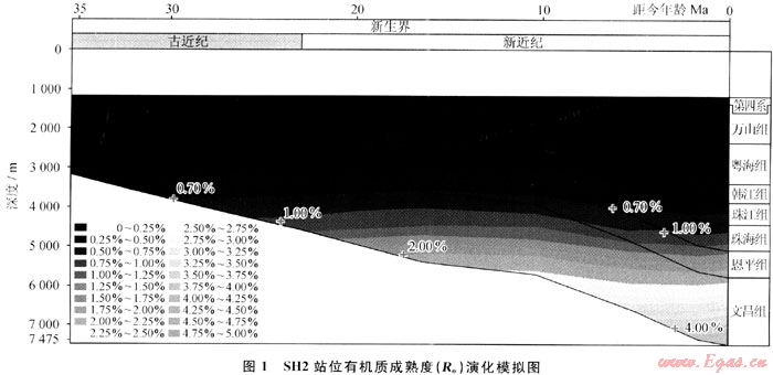 2007年4~6月,廣州海洋地質(zhì)調(diào)查局在神狐海域研究區(qū)內(nèi)實(shí)施了天然氣水合物鉆探,先后在3個(gè)站位成功鉆獲了天然氣水合物實(shí)物樣品,對(duì)其中的SH2站位沉積物樣品中的氣體進(jìn)行的氣相色譜分析的結(jié)果顯示[10]:CH4的體積分?jǐn)?shù)占96%~99%,C2H6和C3H8的體積分?jǐn)?shù)很低,干燥系數(shù)(C1/C2)一般在數(shù)百至1000以上,為典型的干氣。SH2站位含水合物層的總有機(jī)碳含量平均值為0.43%,已達(dá)到了作為生物氣烴源巖的標(biāo)準(zhǔn),對(duì)SH2站位進(jìn)行有機(jī)質(zhì)成熟度的熱演化模擬(圖1),結(jié)果表明:淺部地層珠江組、韓江組、粵海組和萬山組Ro值低于0.7%,多在0.2%~0.6%,處于未熟-低成熟的生烴門限附近,屬于良好的生物氣的烴源巖。這幾套層序厚度大,泥巖含量高,熱成熟低,有機(jī)質(zhì)豐度較高[11],其中,上中新統(tǒng)-第四系海相泥巖有機(jī)碳含量平均為0.22%~0.49%,且不同層位及層段均變化不大,第四系有機(jī)碳含量平均為0.22%~0.28%,上新統(tǒng)有機(jī)碳含量平均為0.30%~0.39%,上中新統(tǒng)有機(jī)碳含量平均為0.49%;上中新統(tǒng)-全新統(tǒng)海相泥巖生烴潛力(S1+S2)平均為0.13~0.32mg/g,與鶯歌海盆地大體一致。由此推測(cè),該區(qū)具備生成生物氣的巨大潛力。