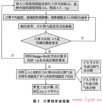 應(yīng)用上述的溫度模型結(jié)合Beggs-Brill方法計算管線內(nèi)溫度、壓力分布時,由于只涉及產(chǎn)出氣的相對密度,因此預(yù)測管線內(nèi)天然氣水合物能否生成時,采用經(jīng)驗圖解法與溫度壓力模型進行耦合[7],從而得到天然氣水合物生成條件預(yù)測理論模型,并編制了相應(yīng)的計算程序,計算程序流程如圖2所示。