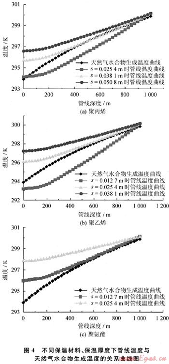 聚丙烯、聚乙烯和聚氨酯作為3種基本的保溫材料被廣泛應(yīng)用在石油天然氣工業(yè)的管道設(shè)計中[4],其熱傳導(dǎo)系數(shù)分別為0.35W/m·K、0.22W/m·K和0.12W/m·K(考慮一定的吸水率),不同保溫材料、保溫厚度下的管線溫度與天然氣水合物生成的溫度關(guān)系圖見圖4。