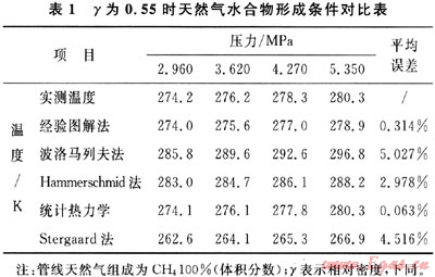 通過對比可以看出,5種方法中統(tǒng)計熱力學(xué)方法的預(yù)測結(jié)果最為準(zhǔn)確,但是需要天然氣組分的詳細(xì)資料,而且計算繁瑣,導(dǎo)致其應(yīng)用受到一定的限制;經(jīng)驗圖解法也可得到較好的預(yù)測結(jié)果,平均誤差小于1%,且計算簡單,使用方便。