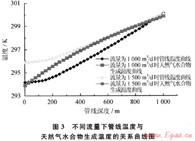 由圖3可以看出,隨著壓力的增加,天然氣水合物的生成溫度逐漸增高。流量增大后,管線溫度曲線明顯上移,且受外界環(huán)境溫度的影響減弱,這是因為流速加快后流體與外界環(huán)境之間的熱交換時間減少所致;而此時天然氣水合物生成溫度曲線卻有輕微的下移,這是因為流量增大后,摩擦損失增大,導(dǎo)致管線內(nèi)對應(yīng)點的壓力減少。也就是說,流量增大導(dǎo)致2條曲線向相反的方向發(fā)展,因而,可以通過調(diào)整流量來實現(xiàn)管線的正常傳輸。在上例中,流量不能低于1500m3/d,這樣才能保證該管線的正常傳輸。