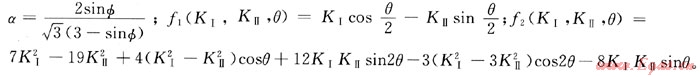 國(guó)內(nèi)外學(xué)者對(duì)裂紋的失穩(wěn)擴(kuò)展研究取得了豐碩的成果,建立了相應(yīng)的斷裂準(zhǔn)則[6~7]通過(guò)適用性分析,筆者選用了基于巖石破壞準(zhǔn)則的巖石斷裂判據(jù)[6]。筆者利用D-P破壞準(zhǔn)則,并結(jié)合裂紋尖端的應(yīng)力場(chǎng)、應(yīng)力強(qiáng)度因子和斷裂韌度提出了該判據(jù),具體推導(dǎo)過(guò)程見(jiàn)本文參考文獻(xiàn)[6]。