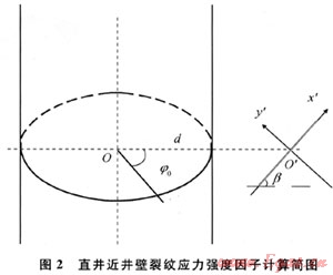 假設(shè):近井壁裂紋擴(kuò)展的開(kāi)始是井壁失穩(wěn)的臨界點(diǎn)。即如果存在井壁裂紋的擴(kuò)展條件,就認(rèn)為井壁會(huì)發(fā)生失穩(wěn)坍塌現(xiàn)象,并且近井壁裂紋擴(kuò)展的開(kāi)始,就是井壁失穩(wěn)的開(kāi)始。根據(jù)此假設(shè),就可以把定量確定裂紋擴(kuò)展的判據(jù)應(yīng)用于確定井壁失穩(wěn)。