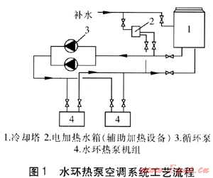 水環(huán)熱泵空調(diào)系統(tǒng)是用水環(huán)路將小型水源熱泵(水環(huán)熱泵機組)并聯(lián)在一起,構(gòu)成以回收建筑物內(nèi)部余熱為主要特征的供熱與供冷空調(diào)系統(tǒng)。這種系統(tǒng)要求建筑物內(nèi)部具有可回收的余熱,通過循環(huán)水將這些余熱分配到需熱區(qū)域,在不需要外界任何能量情況下,不同區(qū)域的水環(huán)熱泵機組可同時從循環(huán)水中取熱與放熱,實現(xiàn)同時供熱與供冷的效果。水環(huán)熱泵空調(diào)系統(tǒng)工藝流程見圖1。