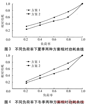 不同負(fù)荷率下夏季兩種方案相對功耗曲線見圖3,以夏季100%負(fù)荷率下的功耗作為計算基礎(chǔ)。由圖3可知,夏季,方案1的相對功耗與負(fù)荷率近似呈線性關(guān)系。方案2在負(fù)荷率為0.2~0.8范圍內(nèi),其相對功耗與負(fù)荷率也具有近似線性關(guān)系。在負(fù)荷率為0.8~1.0范圍內(nèi),其相對功耗發(fā)生劇烈變化,即負(fù)荷率為0.8是方案2相對功耗曲線的拐點。