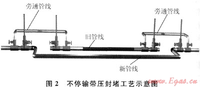 由于停氣實(shí)施新老管線(xiàn)對(duì)接對(duì)下游用戶(hù)影響較大,建設(shè)單位要求該段管線(xiàn)采用不停輸方式進(jìn)行封堵連頭。由于改造段管線(xiàn)兩側(cè)封堵施工點(diǎn)距離長(zhǎng)達(dá)700m,敷設(shè)長(zhǎng)距離旁通管既不經(jīng)濟(jì)又費(fèi)時(shí)間。因此決定采用在舊管線(xiàn)兩端對(duì)接點(diǎn)分別架設(shè)旁通的帶壓封堵工藝,其工藝示意圖如圖2所示。此工藝的優(yōu)點(diǎn)在于無(wú)須架設(shè)長(zhǎng)距離旁通管道,所有工序均在不影響管線(xiàn)內(nèi)高壓介質(zhì)正常輸送的狀態(tài)下進(jìn)行,安全可靠[1]。