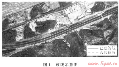 深圳市擬建的地鐵5號(hào)線(xiàn)塘朗段與平南鐵路用地沖突,平南鐵路須向南平移。但鐵路平移將與廣東LNG塘朗段管道發(fā)生沖突,為保證LNG管道的安全運(yùn)行、周邊在建各項(xiàng)目的正常施工及建成后的安全,深圳市政府及有關(guān)方面要求對(duì)該段管道進(jìn)行遷移。該段管線(xiàn)為廣東LNG支干線(xiàn)的一部分,主要向深圳工業(yè)及民用用戶(hù)供氣,已于2006年竣工并投運(yùn)。管道設(shè)計(jì)壓力為9.2MPa,規(guī)格為Φ610mm×12.7mm,材質(zhì)為X65鋼,需改線(xiàn)遷移的管道長(zhǎng)720m。鑒于經(jīng)濟(jì)和社會(huì)影響,改線(xiàn)管道建成后,需與舊管線(xiàn)實(shí)施不停輸帶壓對(duì)接。改線(xiàn)示意圖見(jiàn)圖1。