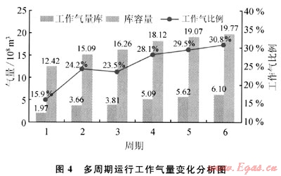 工作氣能力快速提高,工作氣比例總體增加,其變化示意圖見圖4。經(jīng)過6個周期后,工作氣量由1.97×108m3增至6.10×108m3,增加2.1倍。工作氣比例由15.9%增至30.8%,增幅為90%。