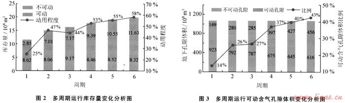 可動用庫存量逐漸增加,不可動用庫存量總體略有降低,庫存的動用程度隨之增加,其變化示意圖見圖2。經(jīng)過6個周期后,可動用庫存量由2.85×108m3增至11.63×108m3,增加了3.1倍;不可動用庫存量由8.62×108m3降至8.32×108m3,降幅為3.5%;庫存動用程度從25%增至58%,提高了1.3倍,但目前仍有42%庫存不可動用。