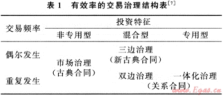 在選擇和設(shè)計交易治理機(jī)制的時候,交易者面臨“有限理性困境”和“機(jī)會主義威脅”兩者之間的持久沖突[6]。交易成本理論提出了有效的交易治理模式:市場治理(非專用型的,通過市場自由選擇)、一體化治理(專用性很強(qiáng),層級管理的效率最高)、關(guān)系合同治理(介于兩者之間的關(guān)系合同),如表1所示。