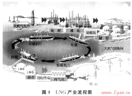 油氣資源開發(fā)利用是一個產(chǎn)業(yè)鏈,其流程如圖1,源頭是油氣田的勘探和開發(fā)。從國外購買油氣資源不是一個簡單的貿(mào)易問題[3]。廣東LNG項目,其確定上游供應(yīng)商、接收站和輸氣管網(wǎng)建設(shè)、LNG船制造、下游電廠建造及居民用氣改造等,都在統(tǒng)一的計劃安排下,同步實施。廣東LNG項目的氣源供應(yīng)商招標(biāo),業(yè)主向澳大利亞、馬來西亞、卡塔爾、印度尼西亞、俄羅斯等國的7家公司發(fā)出邀請,澳大利亞天然氣公司(ALNG)中標(biāo)最終成為廣東LNG的供應(yīng)方,并且自動成為廣東LNG運(yùn)輸項目外商合作伙伴,ALNG推薦殼牌(Shell)公司參加并協(xié)助商船建造工作。國內(nèi)第一條LNG專用船由上海滬東船廠和法國大西洋船廠(Aker yards)合作承建,招商局集團(tuán)與中遠(yuǎn)集團(tuán)合資組建中國第一支LNG船隊,承擔(dān)廣東LNG項目的液化天然氣運(yùn)輸;廣東LNG的接收站及外輸管網(wǎng),則由中海油與BP石油公司牽頭,吸納了國內(nèi)部分燃?xì)馄髽I(yè),發(fā)起成立廣東大鵬LNG公司,負(fù)責(zé)接收站和輸氣管網(wǎng)的建設(shè)和運(yùn)營。