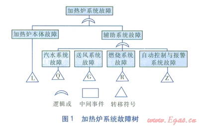 根據(jù)相變加熱爐(以下簡稱加熱爐)系統(tǒng)的結構和功能的層次分解模型[1-3],采用故障樹分析法,分析加熱爐系統(tǒng)出現(xiàn)的故障表現(xiàn)與故障原因的邏輯關系,建立加熱爐系統(tǒng)故障樹(見圖l)。