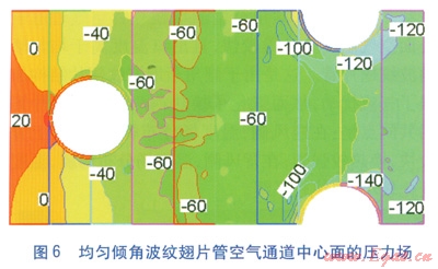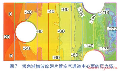 空氣進(jìn)口速度為4m/s時(shí),兩種波紋翅片管空氣通道中心面的壓力(表壓)場(chǎng)分別見(jiàn)圖6、7,圖中數(shù)值單位為Pa。由圖6、7可知,兩種波紋翅片管的壓力分布均比較紊亂。傾角漸增波紋翅片管空氣通道中心面的壓力降要大于均勻傾角波紋翅片管,且隨著翅片傾角的增大,等壓線分布更加稠密。原因是傾角漸增波紋翅片結(jié)構(gòu)對(duì)流體的阻滯和擾動(dòng)作用都較大,阻力比均勻傾角波紋翅片管大。