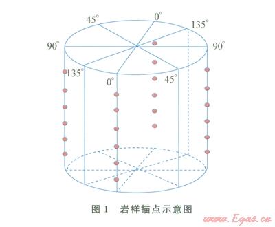 選取渝東南下志留統(tǒng)龍馬溪組露頭巖樣,通過巖樣軸心逆時針作0°,45°,90°,l35°共4條過原點的直線,并延長至徑向,再根據巖樣的長度在軸向做間隔相等的5~10個點(圖1)。接下來,用縱波探頭測量巖樣各點的縱波時差。最后,選擇徑向縱波時差相差不大的大巖樣(可近似為橫向各向同性的模型)作為研究取心對象。
