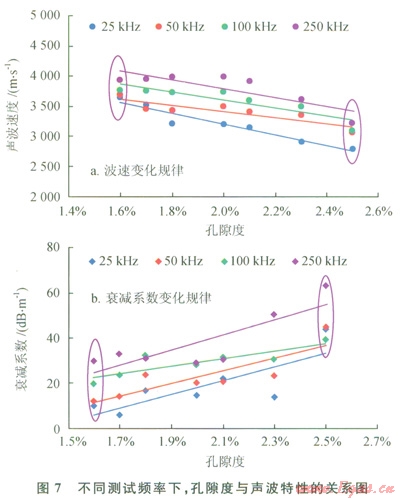 圖7為不同頻率下,孔隙度與聲波特性的關系。