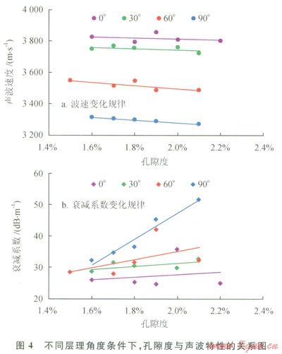 2.2.1不同層理角度條件下,孔隙度對聲波特性的影響