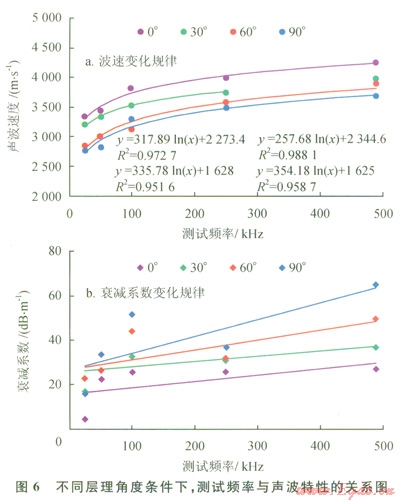 實驗結果表明,隨著測試頻率增加,聲波波速也增大,并且呈對數正相關性(圖6-a),頻散現象明顯,在不同層理角度條件下的各組巖心統(tǒng)計結果非常吻合,具有很強的規(guī)律性。而聲波衰減系數隨著測試頻率的增加總體也呈增大的趨勢(如圖6-b),但是變化幅度規(guī)律性不強,同層理角度條件下的各組巖心統(tǒng)計結果相近。該結果對于儲層評價中聲波參數的選擇具有一定的指導意義。