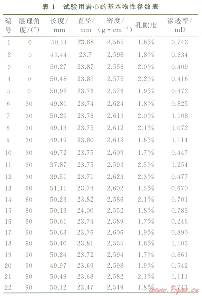 針對上述取心過程,挑選出22塊巖樣,分別采用游標卡尺、電子天平、致密巖心氣體孔隙度測定儀及根據氣測滲透原理自制的滲透率測試裝置對其基礎物性進行了測試分析,結果見表l。從巖心分析及測試結果可以看出,巖樣巖性以黑色、灰黑色及深灰色頁巖、粉砂質泥巖為主,孔隙度變化范圍為l.5%~2.5%,大部分巖樣的滲透率小于lmD。