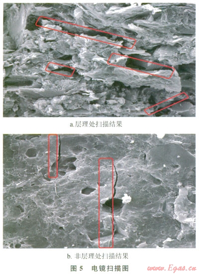 頁巖的層理發(fā)育方向是研究和表征層理最重要的參數之一。對頁巖進行電鏡掃描(圖5)可知,層理面處的膠結物較多,黏土礦物的產狀相對比較混亂,且相對非層理處的微裂縫更加發(fā)育,可知層理面的存存減小了波速,增加了衰減。因此,圖4-a中出現了波速在層理為90°時要遠小于層理為0°時的情況。層理角度變大、衰減增加是由于角度越大,聲波穿透的層理數增加所致,孔隙度增加層理面的微裂縫數也會增加,因此出現圖4-b所示的增加規(guī)律。利用上述規(guī)律,可以綜合利用聲波資料進行儲層評價,對層理角度進行預測。