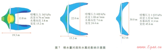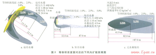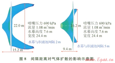 下面對扇形水幕的參數(shù)進行研究,包括噴水量和水幕和擴散源之間的間隔,這二者是影響水幕阻擋效果的主要因素。圖7顯示了不同水流量下,水幕對氣體擴散的影響,在相同的大氣條件下,水流量越大,形成的水幕尺寸也就越大。當扇形水幕流量為l.32m3/min,壓力1035kPa時,水幕高度為11.4m,寬度45.6m,LNG蒸發(fā)氣體下風(fēng)向擴散的安全距離為8.3m。