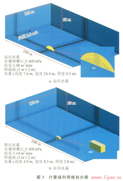 對比相同壓力、相同流量下的扇形水幕與矩形水幕,根據(jù)表1中兩種水幕的壓力和流量,兩個錐形水幕的流量與一個扇形水幕的流量近似相等,并可以近似地看成一個矩形水幕。對于上述泄漏場景下的擴散情形,分別采用扇形水幕和矩形水幕進行阻隔氣體,筆者對兩種水幕進行CFD模擬計算,計算域和網(wǎng)格劃分如圖3所示。由于計算域為對稱區(qū)域,所以為了節(jié)省計算資源,縮短計算時間,求解時僅對計算區(qū)域的一半進行計算[14]。