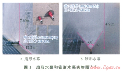 在LNG場站消防系統(tǒng)中,經(jīng)常會用到兩種噴射水幕,即扇形水幕(Flat Fan Spray Water Curtain)和錐形水幕(Cone Spray Water Curtain) [8,10](如圖l)。對于扇形噴射水幕的形成,工業(yè)中經(jīng)常采用如圖1-a的裝置,將高壓水柱噴射到金屬擋板上,水柱沿擋板上行,呈扇形或者半圓形展開,一般扇形水幕為可移動式水幕;錐形水幕則是噴頭由下向上噴出形成,呈一個倒立的錐形,一般情況下需要數(shù)個噴頭并排一起工作。