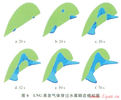 以穩(wěn)態(tài)速度場為初始條件,打開泄漏源,開始做瞬態(tài)計算,擴散云團與時間的依賴關(guān)系見圖6。圖6中所示為體積濃度2.5%的等濃度面,t=0時,擴散開始,并保持LNG液體在積液池內(nèi)蒸發(fā)速率恒定[0.12kg/(m2·s)]??梢杂^察到,大約t=20s時,擴散氣體已經(jīng)到達水幕位置,并開始穿越水幕,由于LNG擴散氣體的重氣效應(yīng),側(cè)風(fēng)向尺寸較大,而豎直高度較小,同時,水幕的阻力系數(shù)沿徑向變化,距離中心點越遠,阻力系數(shù)越小,所以擴散氣體在穿透水幕時,先從水幕的邊緣處開始,然后從頂部開始,逐漸向水幕的噴射中心點處靠攏,隨著時間的延長(大約t=50s時),水幕場景下的擴散到達穩(wěn)態(tài),并保持云團尺寸不變(該處云團尺寸指體積濃度為2.5%的等濃度面),下風(fēng)向擴散距離l3.2m,側(cè)風(fēng)向擴散距離20.0m。