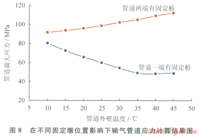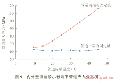由計(jì)算結(jié)果分析,管道上下兩端有固定墩約束時(shí)較管道一端有固定墩約束事產(chǎn)生了較大應(yīng)力。兩端有固定墩約束時(shí),管道應(yīng)力隨著內(nèi)外壁溫差的減小而增大。這是由于溫度增加造成管道內(nèi)等效熱應(yīng)力增加。由于兩端固定,輸氣管道在軸向上不能得以伸長,應(yīng)力得不到有效釋放,因此,管道為克服熱脹冷縮效應(yīng)及位移約束而產(chǎn)生了較大不均勻分布的應(yīng)力。管道一端固定,應(yīng)力隨著溫差的減小而減小,這是由于溫差減小,管道不均勻分布的應(yīng)力隨著軸向的伸長變形得以釋放而減小。由此可知,為減小管道應(yīng)力,設(shè)置固定墩時(shí),間距應(yīng)增大,并且保持在一定的范圍內(nèi),既能減小軸向變形又能滿足應(yīng)力釋放,從而減小管道應(yīng)力大小。