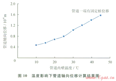 由計(jì)算結(jié)果可知,相對于管道一端有固定墩約束,管道兩端有固定墩約束時(shí)產(chǎn)生的應(yīng)力較大。在內(nèi)外壁溫差較小時(shí),隨著輸氣溫度的增加,管道一端有固定墩時(shí)產(chǎn)生的熱應(yīng)力趨于水平,由此可知溫度對管道應(yīng)力影響較小,這是因?yàn)檩S向伸長得到補(bǔ)償從而減小了管道產(chǎn)生的集中應(yīng)力。在內(nèi)外壁溫差保持不變時(shí),管道應(yīng)力不發(fā)生較大變化。在內(nèi)外壁溫差較小時(shí),管道兩端有固定墩約束情況下管道最大應(yīng)力隨輸氣溫度的增加而明顯增加,遠(yuǎn)大于管道一端有固定墩約束時(shí)產(chǎn)生的應(yīng)力。管道內(nèi)輸氣壓力的增加造成管道應(yīng)力增加。在溫度影響下管道一端有固定墩約束時(shí)軸向位移計(jì)算結(jié)果如圖l0所示。