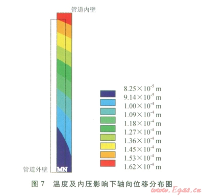 由分析可知,在內(nèi)壓和溫度影響下,最大應(yīng)力在管道內(nèi)壁產(chǎn)生,約50 MPa。由此可知,溫度作用中內(nèi)壓的變化會(huì)影響管道應(yīng)力大小及分布。由于管道只有一端有固定墩約束,管道司以沿軸向嚴(yán)生伸長變形,應(yīng)力通過軸向伸長得以補(bǔ)償而減小,軸向最大位移為0.Ol62mm。