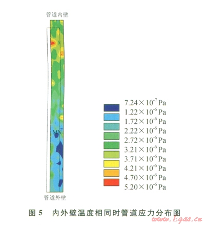 由計(jì)算可知,在x軸處有固定墩約束軸向位移,管道無內(nèi)外壓作用,管道外壁熱量損耗,較內(nèi)壁溫差不大時(shí)(圖4),管道內(nèi)壁溫度為氣體溫度50℃,熱量由內(nèi)壁沿徑向均勻分布于外壁,因此,在內(nèi)外壁產(chǎn)生了不均勻的熱應(yīng)力。當(dāng)內(nèi)外壁溫度相同、沒有溫差影響時(shí)管道內(nèi)壁(圖5),管道內(nèi)外壁溫度為50℃。在一端固定墩的約束下,管道應(yīng)力分布極不均勻,軸向伸長量達(dá)到0.019mm,這是由于溫度影響產(chǎn)生的熱脹冷縮效應(yīng),管道增加的應(yīng)力經(jīng)過軸向的伸長補(bǔ)償,減小了應(yīng)力集中分布的趨勢,從而在軸向產(chǎn)生了較大的位移。
